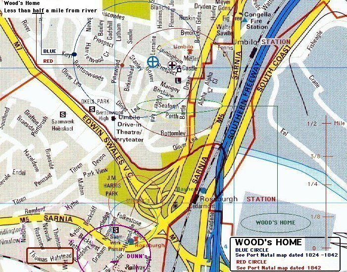The map of Port Natal dated 1842 (see next image) shows the WOOD's home to be 1/8 mile (200 metre) east of the southern tip of the bottom of the 'Knuckle' in the hill. This would place the WOOD's home between Seaforth and Perth Roads. Just above the bend in Perth. (Approximate Google Earth Coordinates: -29.894532,30.97844)