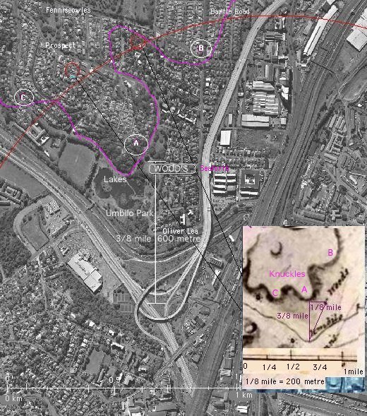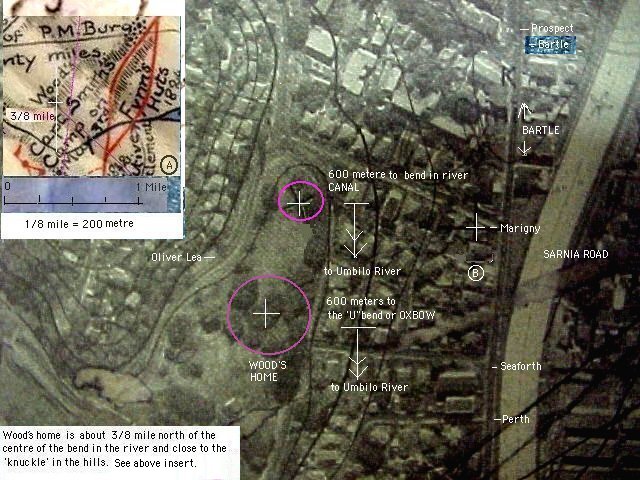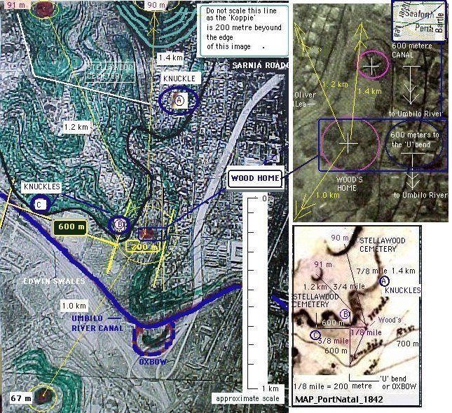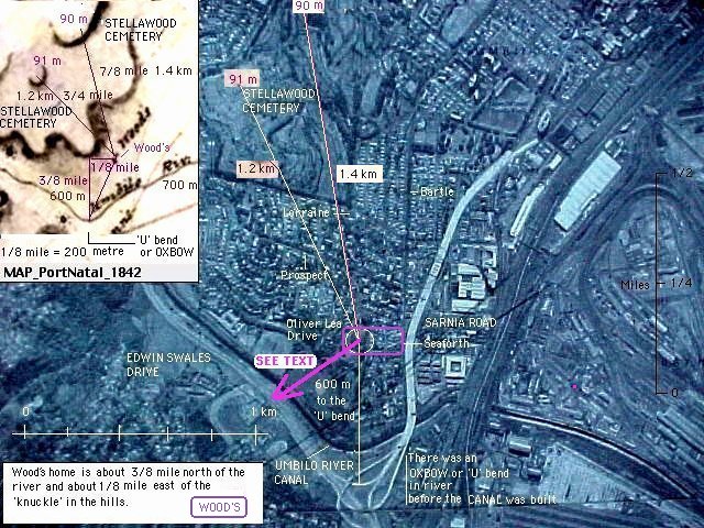 Orthophotographic Map of the area above the bend in the Umbilo RiverThe above orthophotographic map shows the current estimate of the position of the Wood family home relative to circa 1990 landmarks. The map of Port Natal dated 1824-1842 and the map of Port Natal dated 1842 shows the WOOD's home as 3/8 mile (600 metre) north of 'U' bend in the Umbilo river. Whilst these are estimates of the position of the WOOD's home the property would have extended for a considerable distance around the points shown above.The map dated 1842 shows the 91 metre and 90 metre high 'koppies' in the Stellawood Cemetery as well as a 67 metre 'high point' at the top of Jacob's Ladder on Sarnia Road. This 'high point' is 1 km to the South West of the WOOD's and, together with the distances to the two 'Stellawood' high points, confirms the position of the WOOD's home. See the purple arrow on the above map