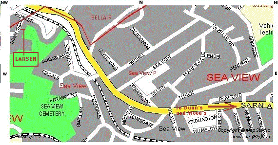 Recent Map of Durban, Natal, South Africa - Suburb of SeaViewRobert Dean Wood wrote: David Larsen lived near the Wood family home when he was a youngster. He first lived in Hereward Road, Umbilo and later moved to Sunnyside Road, SeaView. Hereward Road is within a mile of the Umbilo Railway Station and Sunnyside Road is about 4 miles away, between Rossburgh and Bellair, on the old Sarnia Road to Pinetown and Pietermaritzburg. SeaView is located between the Umhlatuzana and Umbilo Rivers. (David Larsen: larsen@salbu.com) (Robert Dean Wood: rwoodean@attbi.com)