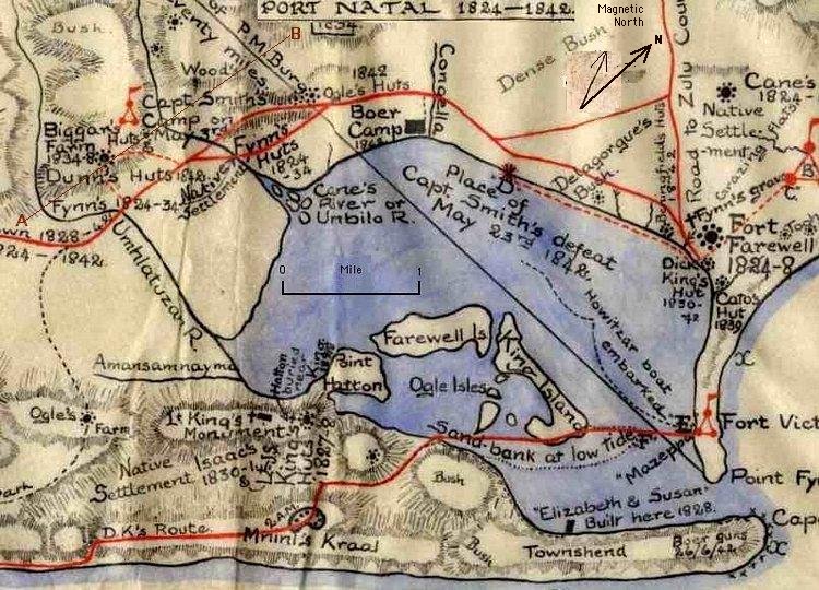 Historical Background: In 1823 Francis George Farewell, formerly a lieutenant in the British navy, with other merchants of Cape Town, formed a company to trade with the natives of the southeast coast. In the brig Salisbury, commanded by James S. King, who had been a midshipman in the navy, Farewell visited Port Natal, St Lucia and Delagoa Bays.The voyage was not successful as a trading venture, but Farewell was so impressed with the possibilities of Natal both for trade and colonization that he resolved to establish himself at the port. He went thither with ten companions, among them Henry Francis Fynn. All the rest save Farewell and Fynn speedily repented of their adventure and returned to the Cape, but the two who remained were joined by three sailors, John Cane, Henry Ogle and Thomas Holstead, a lad.