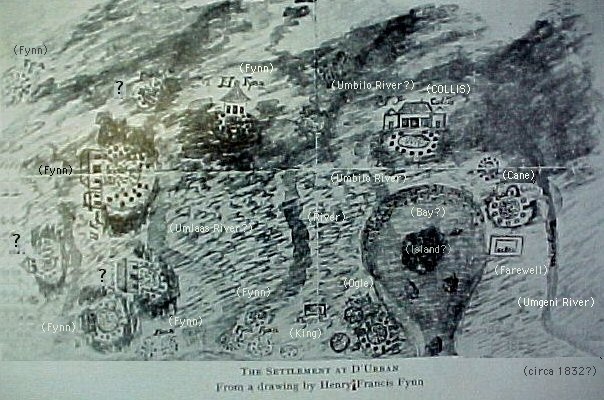 Sketch of Port Natal - circa 1832This sketch by Henry Francis Fynn shows the location of the homes of the Fynn family and other early settlers. The WOOD family may have acted as caretakers of the COLLIS home both before the arrival of Mrs Collis family and after James Collis died in an explosion.