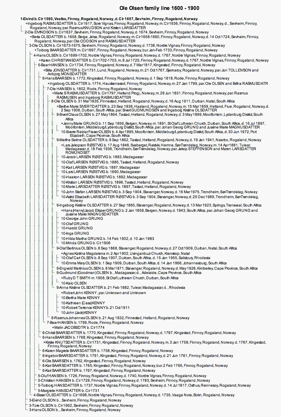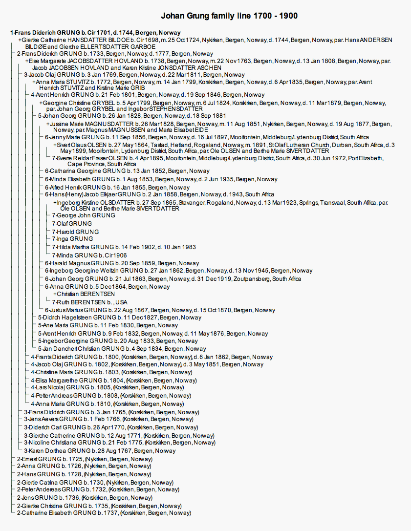 Marie Grung, daughter of Johan Georg, and her brother Johan George, emigrated to South Africa.  From 1888 to 1890 Jenny taught at Umpumulo Mission in South Africa.  In 1991 she married Sivert Olaus Olsen, merchant son of Ole Olsen, in South Africa.  They had one child, Sverre Reidar Fraser Olsen, our father.  Johan George did not marry and had no children.