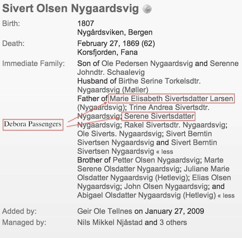 DVL Note: From the above information we can see that the Miss Serene Larsen on the Debora was  Serene Olsdtr B1838-12-20 the older sister of Sivert Andersen Hordnes' widow, Marie Elisabeth Olsdtr.  The widow Marie Elisabeth married her second cousin Fredrik Johan Larsen (Lervig - Leervig - Lervik). Fredrik Johan Larsen later adopted the three sons of Sivert Andersen Hordnes. They were three of the "Larsen" children on the Debora. Their names were Angele Edvard Sivertsen and the twins Emil Sivertsen, and Sigvart Sivertsen. These three boys later used the surname of their stepfather Fredrik Johan Larsen. Sigvart was my grandfather.