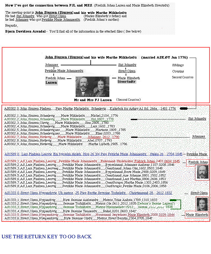 Here you have the parents, grandparents and s.o. for Marie as well as information on her family connection to Fredrik Johan Larsen !!! - the common ancestors being John Sjursen (Siursen) and his wife Marthe Michelsdtr. (See Kirkebok for Askøy A1 fol. 266a 1401,1776)
