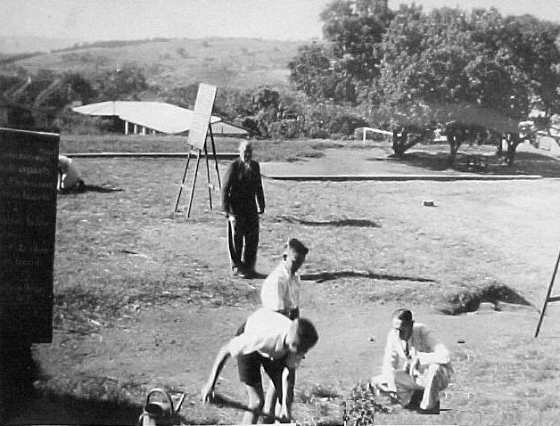 of the Sea View (Seaview) Government School. Planting the "Boys Tree" are David Larsen (with spade) and Richard Askham. Mr Wolmaraans (kneeling) supervises. The school Headmaster Mr C Selwyn-Smith is standing in the background. (Kneeling behind the left hand blackboard is one of two pupils planting the "Girls Tree")