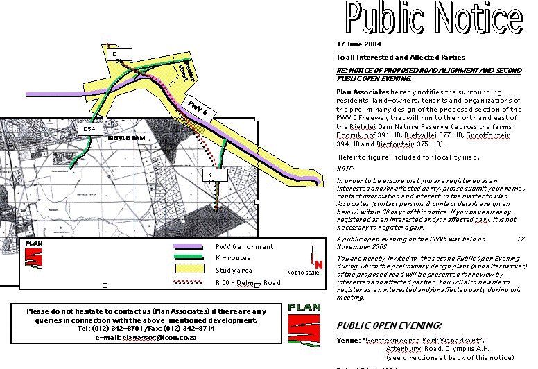 In order to be ensure that you are registered as an interested and/or affected party, please submit your name , contact information and interest in the matter to Plan Associates (contact persons & contact details are given below) within 30 days of this notice. If you have already registered as an interested and/or affected pary, it is not necessary to register again.A public open evening on the PWV6 was held on 12 November 2003