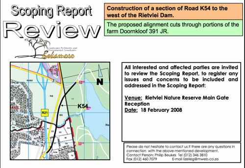 Attached find an invitation to review the Scoping report for the K54 West of the Rietvlei dam.