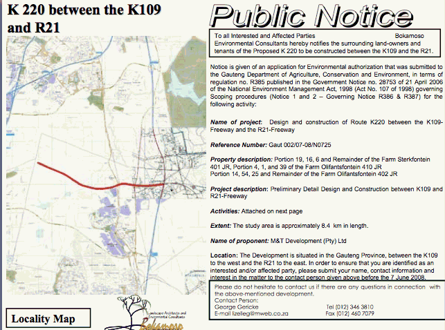 Subject: DKOA: Bokamoso Notice: Proposed Road K220 between the K109 and R21 - Gaut 002/07-08/N0725