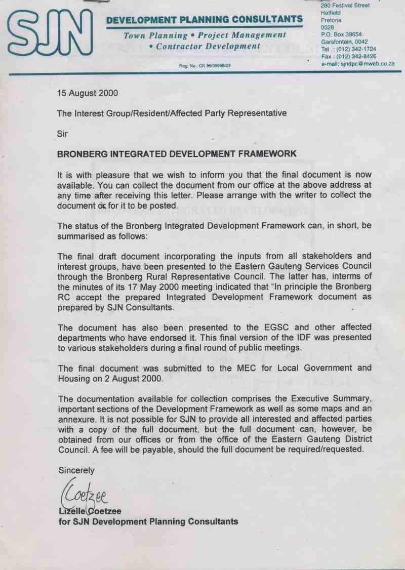 Note: SJN, the authors of the Bronberg Integrated Development Framework document dated JULY 2000, took cognisance of the above recommendations and make specific reference to the area around the the Rietvlei Game Reserve. The Rietvlei Game Reserve is made up of the farms Rietvallei 377-JR and Witkoppies 393-JR. The farms Doornkloof 391-JR, Rietfontein 375-JR and Grootfontein 394-JR border on the Reserve. See copy of the SJN covering letter below.