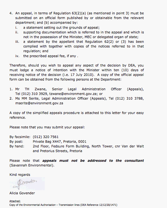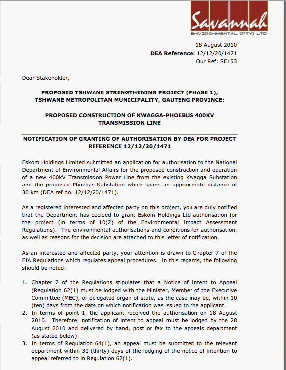 Subject: Fwd: DKOA: Savannah Notice - Tshwane Strengthening Project (Phase 1) Environmental Authorisation