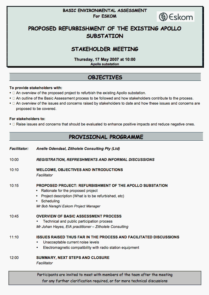 Please see below an invitation letter and draft programme to a stakeholder meeting with Eskom on Thursday 17 May 2007 at 10:00 at the Apollo substation. The purpose of the meeting is clearly indicated in the attached documents.