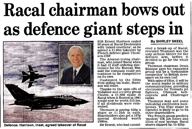 2000 Sir Ernest Harrison ended 50 years at Racal as he agreeded a £1.8bn takeover
